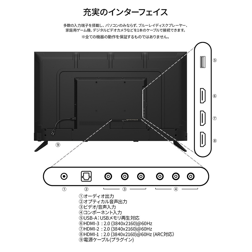 | 入出力端子 | HDMI 2.0×3 (60Hz) ビデオ/音声入力端子 ×1 コンポーネント入力端子 ×1 オプティカル音声出力端子 ×1 オーディオ出力 ×1 |