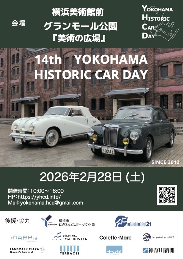 クラシックカーの魅力を間近で楽しめる「横浜ヒストリックカーデイ14th」が、会場を新たに横浜美術館前・グランモール公園「美術の広場」に移し、2月28日(土)に開催されます。