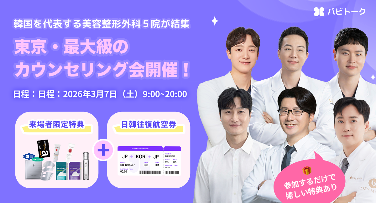 (バビトーク=2026年02月09日)韓国の美容医療プラットフォーム「バビトーク」は、 韓国の有名美容外科・皮膚科5院と提携し、韓国美容施術に関する情報を提供するオフライン相談会を、2026年3月7日(土)、東京・TKP新橋汐留カンファレンスセンター10Aホールにて開催します。相談会は午前9時から午後8時まで実施される予定です。