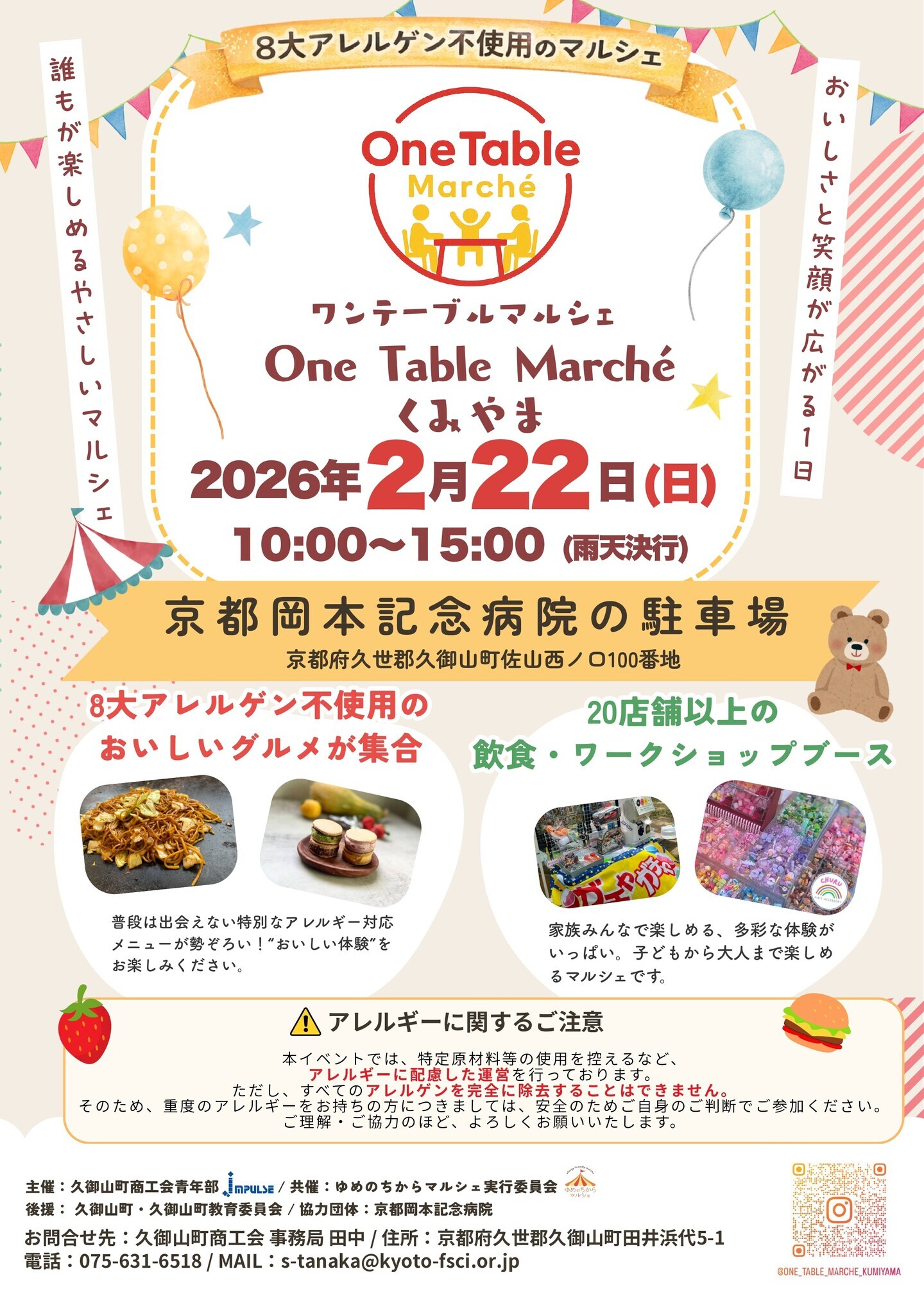 久御山町商工会青年部(京都府久世郡久御山町)が初開催する、8大アレルゲン不使用イベント「One Table Marchéくみやま(ワンテーブルマルシェくみやま)」に、ゆめのちからマルシェが共催!アレルギー週間の2026年2月22日(日)に京都岡本記念病院駐車場にて開催されます。キッチンカー、縁日など約25店舗が出店します。