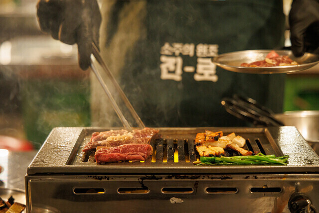 看板や食器まで釜山そのままの世界観を再現した「ミリネヤンコプチャン 赤羽店」。カウンターが主体の卓上には焼き台が設置され、お客様の目の前でスタッフがお肉を焼き上げ、最高の瞬間で提供するサービスも特徴です。料理だけでなく、スタッフとの会話も楽しめます。