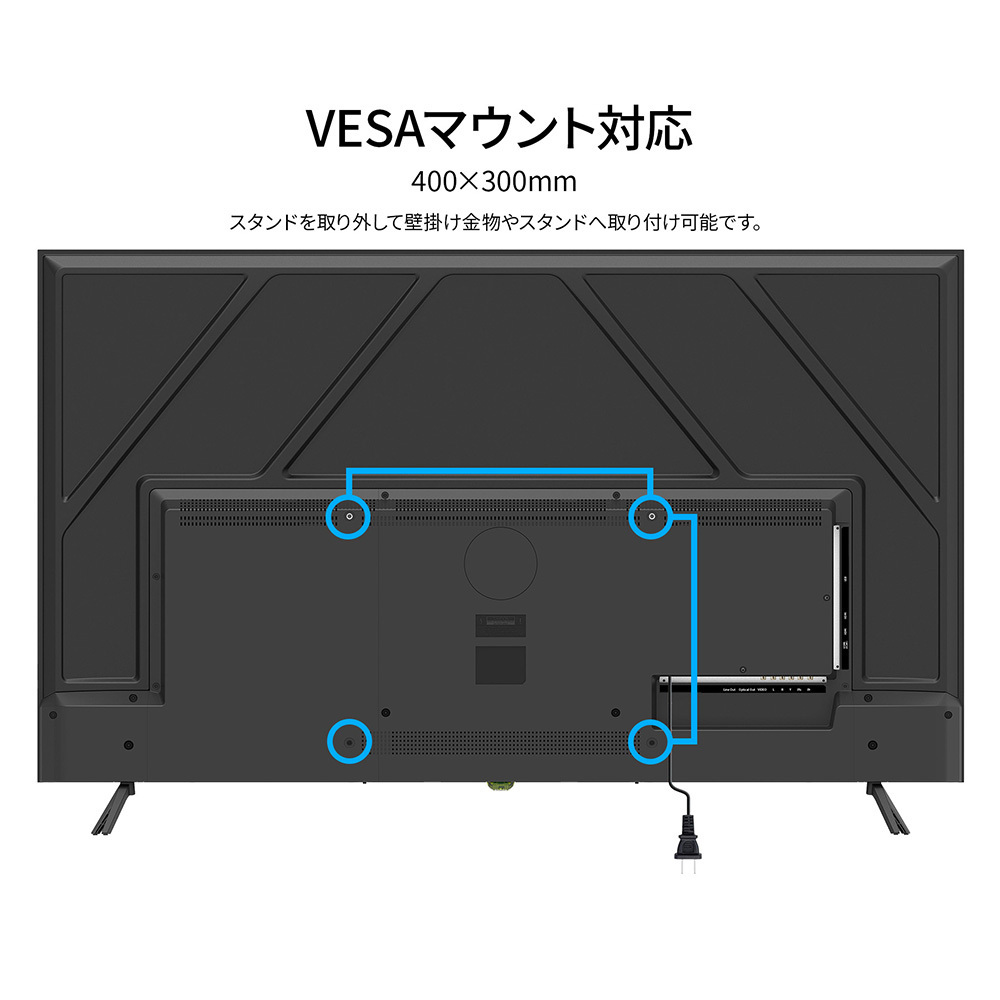 400×300mm の VESA マウントに対応しますので、対応の壁掛け金具やスタンドなどに取り付けが可能です。 8W×2のスピーカーを内蔵します。便利なリモコンを同梱。 USB メモリ再生、メニュー操作、音量調整や入力切替などの操作を行えます。本製品には、2年間のメーカー保証が付きます。