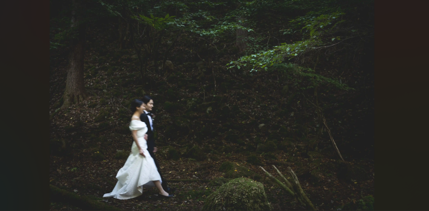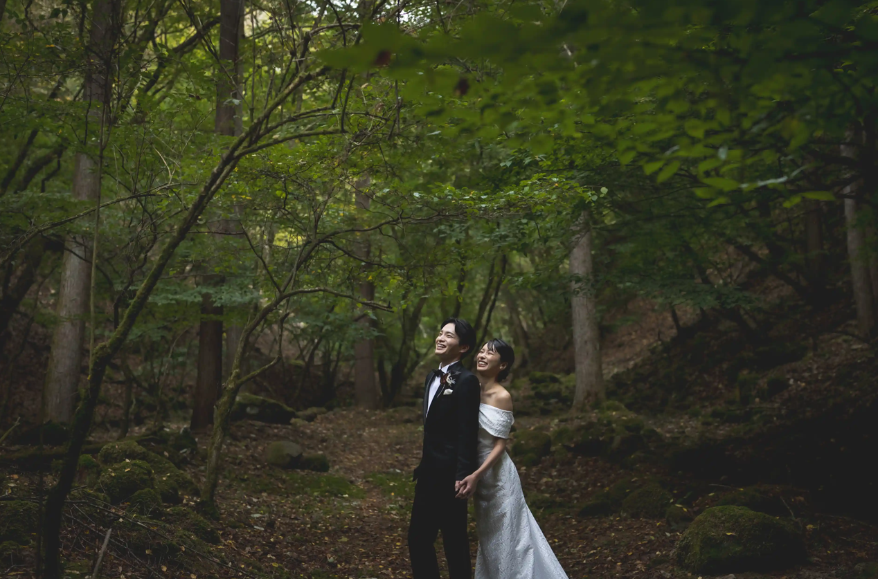 写真撮影は、思い出を振り返るための記録ではなく、滞在のひとときと自然に重なり合う“体験”として行われます。ポーズや演出をつくり込むのではなく、森に差し込む光や風の音、ふたりの表情、静かに流れる時間——その日、その瞬間の空気をありのままに写し取っていきます。そのようにして残された一枚一枚は、その場でしか体験できない旅の記憶として、心の奥に深く刻まれていくことでしょう。明神館という特別な場所で過ごす時間そのものが、祝福の記録となる。それが私たちがご提案する、エロープメントウエディングの新しいかたちです。