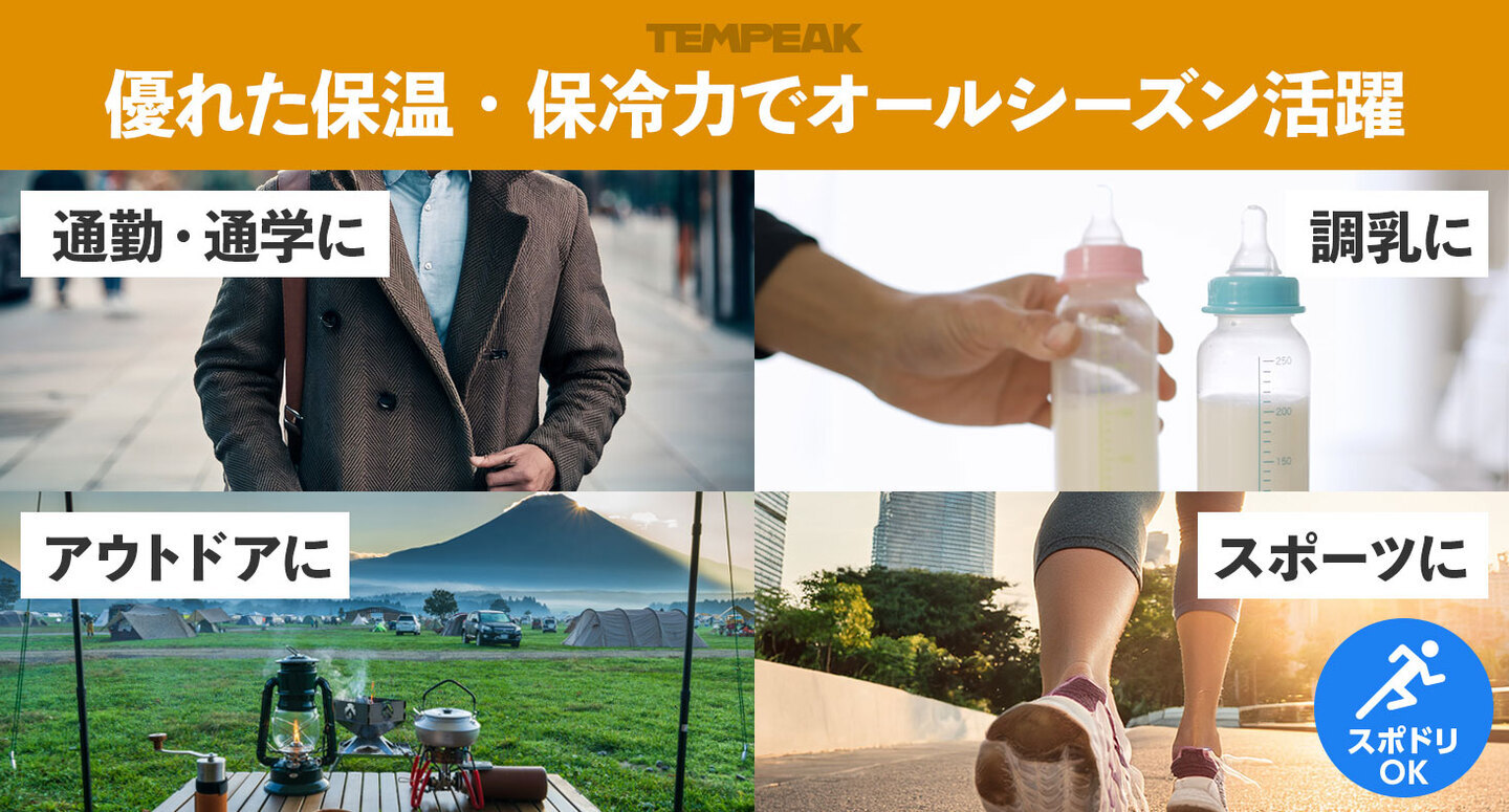 本製品の優れた保温・保冷力は、オールシーズンあらゆる場面に役立ちます。例えば「長時間の勉強や仕事中、アツアツのコーヒーを飲んですばやくリフレッシュしたい/冬の駅のホームで、帰りの電車を待つ間もアツアツのドリンクで温まりたい/調乳用の熱湯を常備しておきたい/夏のアウトドアでも最後まで美味しい温度で水分補給がしたい/…」などといった多様な場面に活躍。いつでもどこでも気軽に持ち運んで飲み頃温度のドリンクを楽しむことができます。