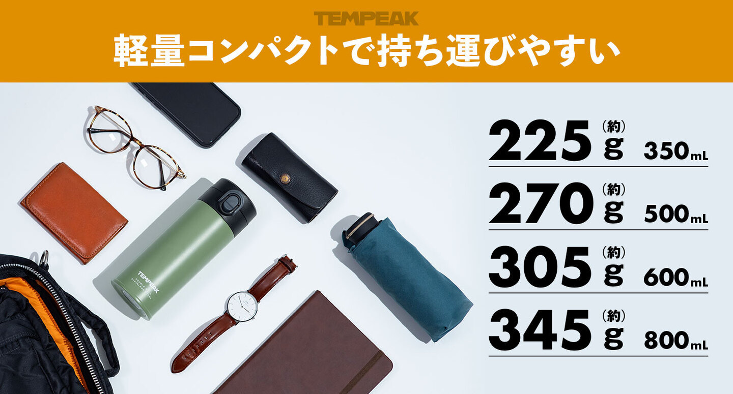 普段使いの水筒として持ち運びやすさも重視した本製品は、350mLで約225gと軽量でストレスなく持ち運べます。