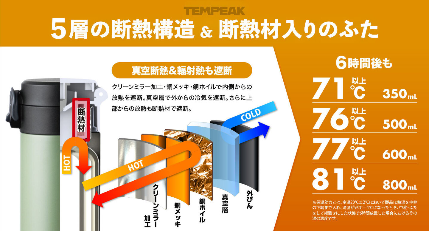 ワンタッチタイプの水筒は、構造上ふたから熱が逃げやすくスクリュータイプの水筒よりも保温力が低くなる傾向があります。また、本体の口が広くなると上部から熱が逃げ、保温力は弱まってしまいます。本製品は、ワンタッチタイプで広い口径を維持しながら一般的なスクリュータイプの水筒にも引けを取らない保温力を実現しています。その秘密は、上部からの放熱を最小限に抑えるふた内部の厚いウレタンの断熱層と、TEMPEAKシリーズ最大の特徴である“5層の断熱構造”です。本体は内びん内側のクリーンミラー加工、内びん外側の銅メッキ加工、内びんに巻かれた銅ホイル、真空層、外びんの5層構造。真空層で外気温の影響を遮断するだけでなく、鏡面のようにツルツルとした内びんのクリーンミラー加工・銅メッキ加工と、銅ホイルは真空中を電磁波として移動してしまう輻射熱(ふくしゃねつ)を反射し、放熱を抑えます。