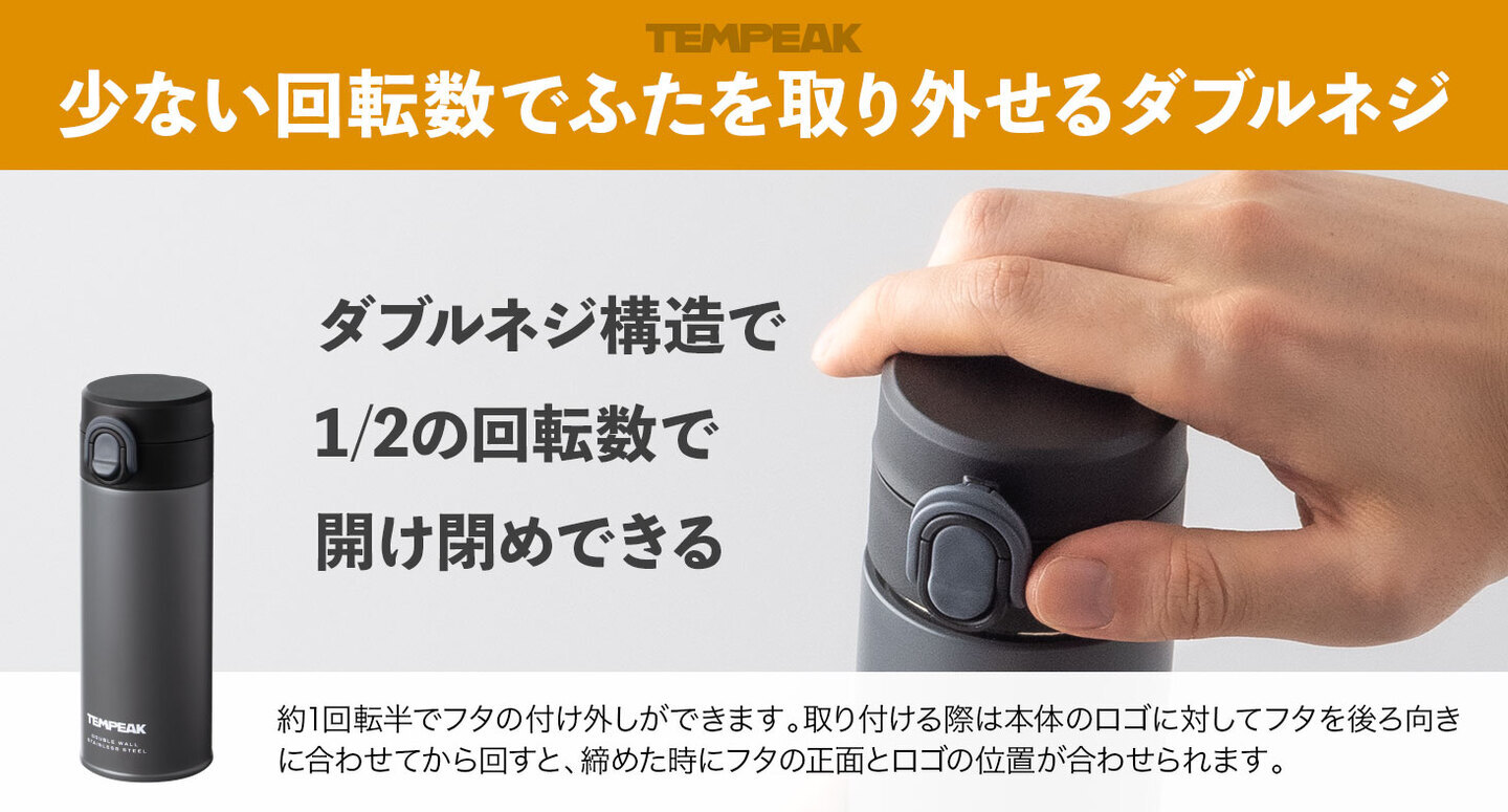 一般的な水筒のネジ山は1本ですが、本製品はネジ山が2本のダブルネジ構造を採用しています。これにより本来の1/2の回転数でふたの取り外しが可能で、より快適な水分補給を実現します。