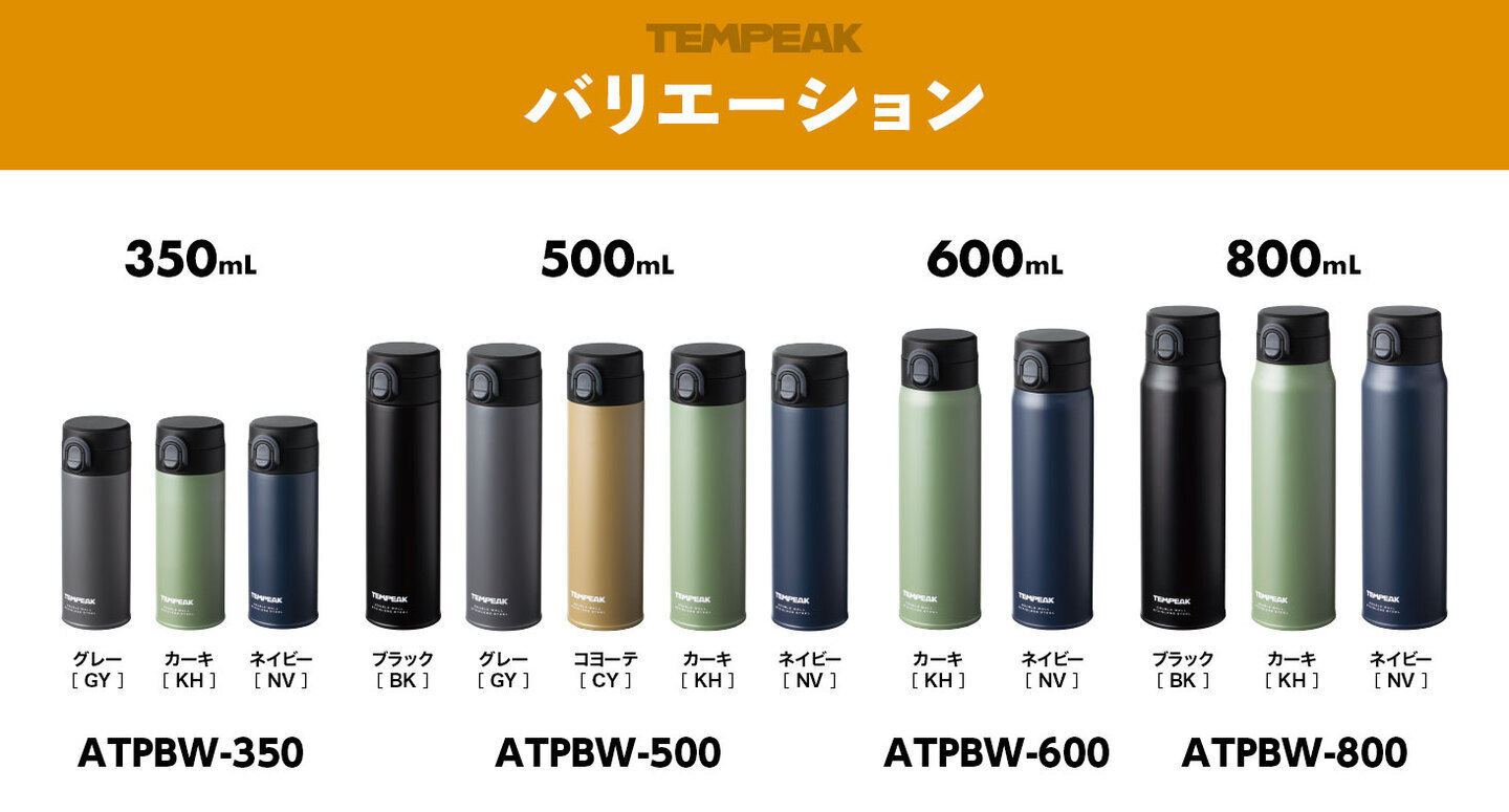 色:ブラック[BK](500mL, 800mL)/グレー[GY](350mL, 500mL)/コヨーテ[CY](500mL)/カーキ[KH](350mL, 500mL, 600mL, 800mL)/ネイビー[NV](350mL, 500mL, 600mL, 800mL)