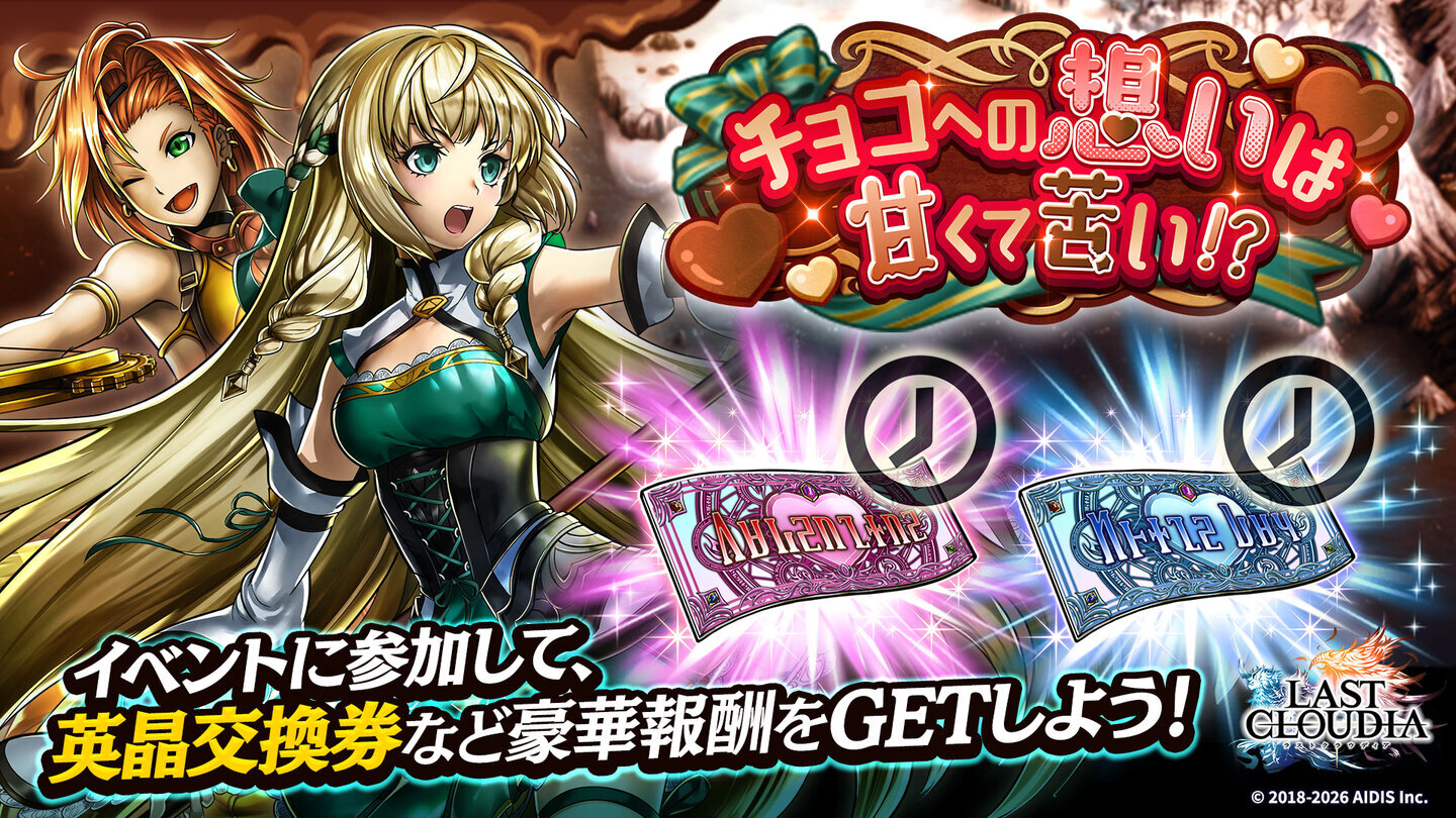 株式会社アイディス(本社:東京都渋谷区、代表取締役社長:早貸 久敏)より好評配信中のスマートフォン向けRPG『ラストクラウディア』において、本日2月12日(木)のアップデートにて、新ユニット「魔神ラブレス」と新アーク「生命律研究院」が登場しましたのでお知らせいたします。また、イベント「チョコへの想いは甘くて苦い!?」も併せて開催となり、こちらのイベント報酬では女性ユニットや男性ユニットからのお手紙が今年も貰うことができます。引き続き「ラストクラウディア」に、ぜひご注目ください。