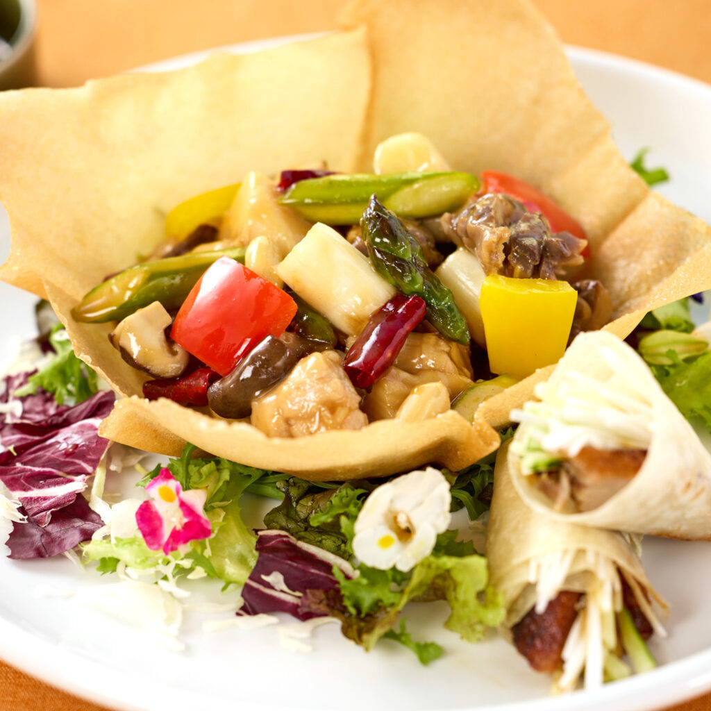 香ばしく炒めた鶏肉に、王道の北京ダックを添えた、満足感のある贅沢な一皿です。