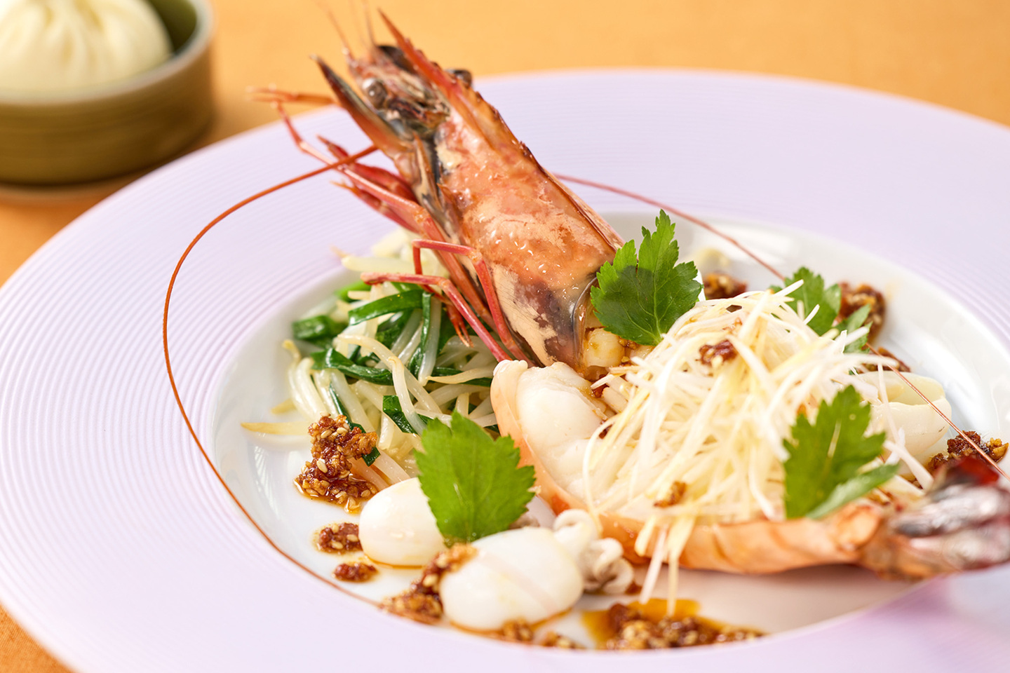 有頭海老と甲イカをふっくら蒸し上げ、香ばしい葱の風味が広がる醤油ベースの香油で仕上げた一皿です。海老の甘みが引き立つ、上品な味わいを楽しめます。
