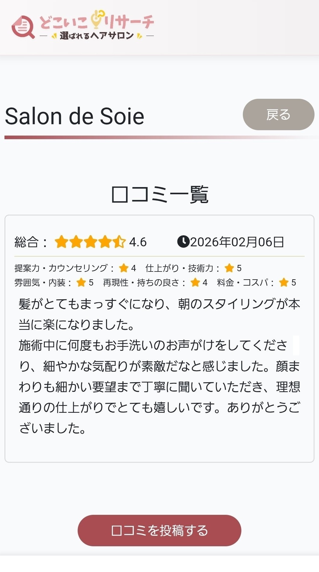 口コミは、実際に通われている方の「リアルな声」を知ることができ、利用者が自分に合ったヘアサロンを選ぶために欠かせない情報源になります。また、ヘアサロン側にとっても、お客様の声に耳を傾け、ひとつの「気づき」を得る場所にしていただきたいと考えています。