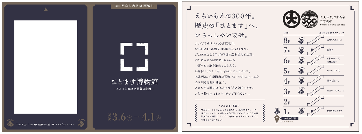 各階にまたがる「ひとます博物館」の展示物を、スタンプラリーのように回遊しながら楽しめる「歴史展リーフレット」もご用意。各階でスタンプを集め、重ねていくことで、江戸末期の心斎橋店の浮世絵が完成する特別なおみやげになります。