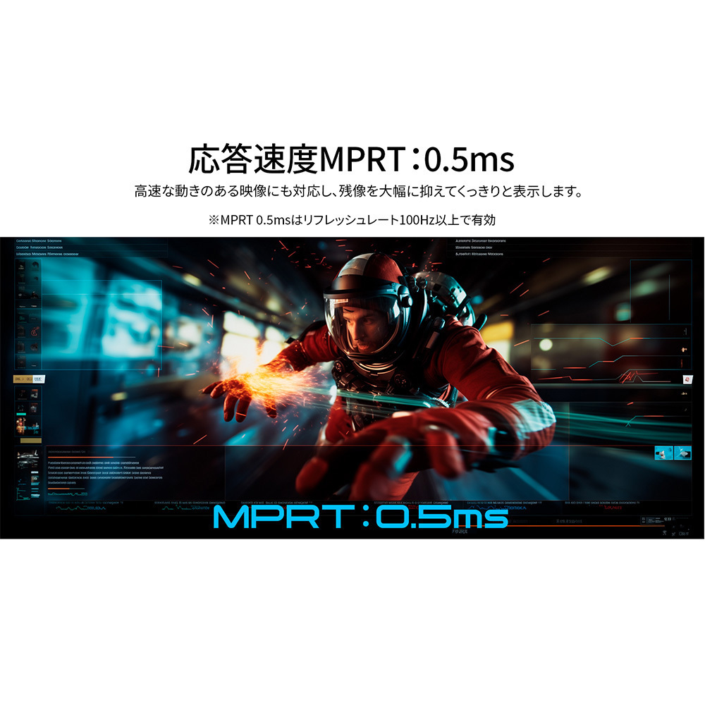 144Hzの高速リフレッシュレートと0.5ms(MPRT)の応答速度により、高精細で滑らかな映像表現を実現し、FPSなどの動きの速いゲームでも快適なプレイが可能です。※MPRT:0.5msはリフレッシュレート100Hz以上で有効。