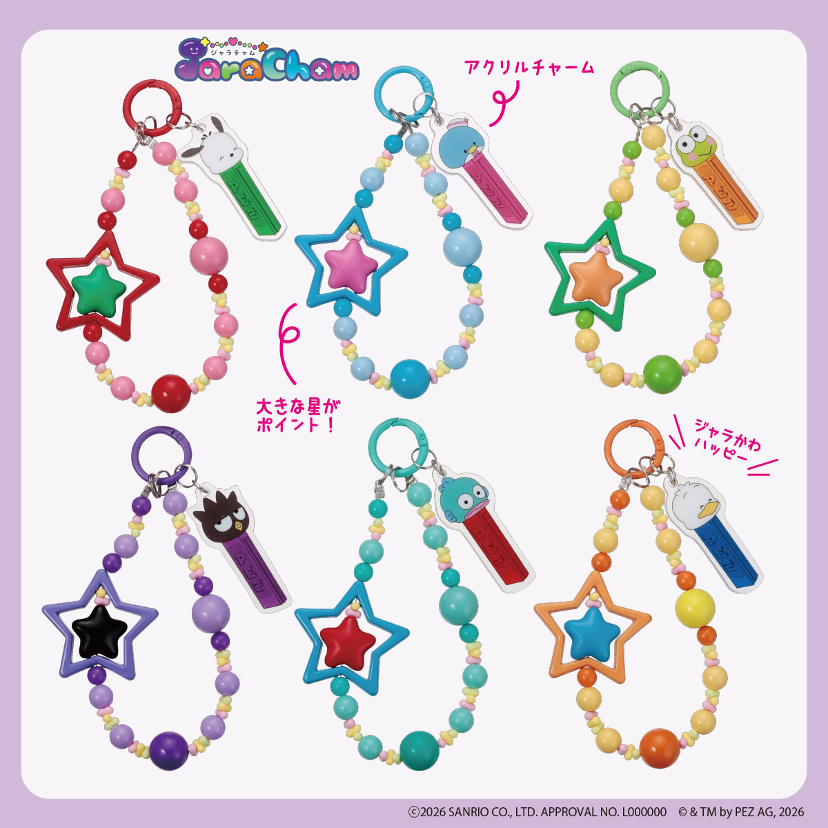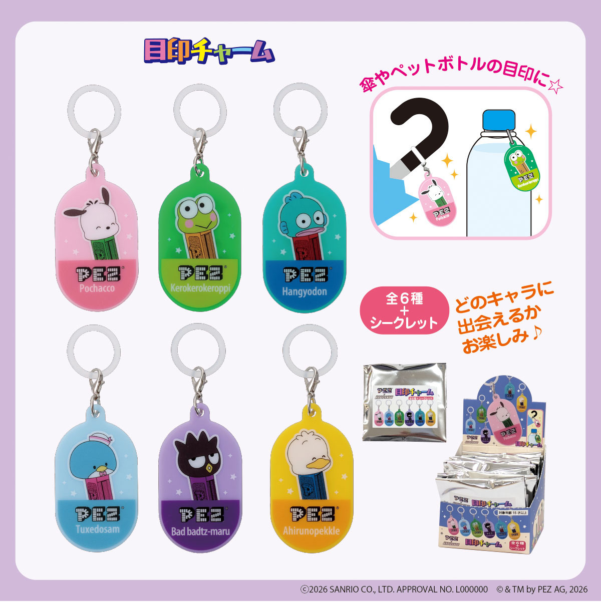 「PEZ×はぴだんぶい 目印チャーム」のみ、全6種+シークレット1種のブラインドパッケージ形態。他の商品はいずれも「ポチャッコ」「タキシードサム」「けろけろけろっぴ」「バッドばつ丸」「ハンギョドン」「あひるのペックル」の、全6種のラインナップです。また、今後は立体フィギュアのキーチャームの発売も予定しています。