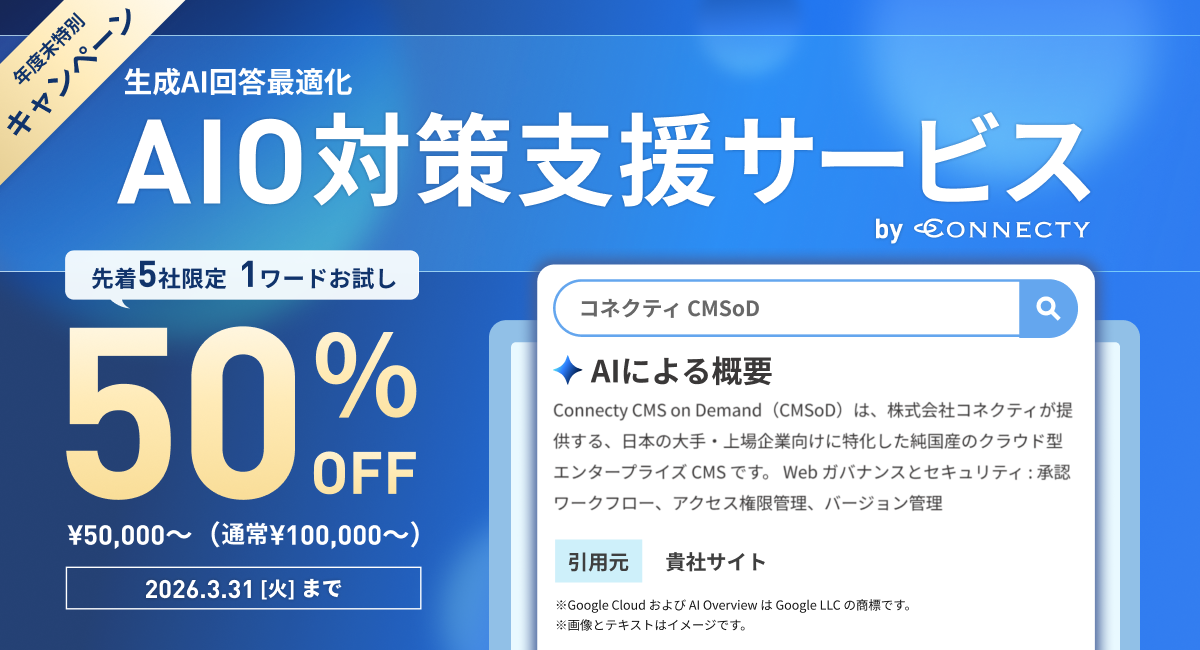 国産エンタープライズ・クラウドCMS・CDPの提供を基盤に、企業のデジタル戦略を支援している株式会社コネクティ(本社:東京都新宿区、代表取締役 服部 恭之、以下コネクティ)は、当社のデジタルマーケティング支援サービス「CEC(Connecty Engagement Center)」の新メニューとして、Google検索機能「AIによる概要(AI Overview)」に自社コンテンツを引用させ、視認性を高める「AIO対策支援サービス」の提供を開始いたします。また、2026年3月末までの5社限定で、初期検証を支援する「年度末特別キャンペーン」を実施いたします。