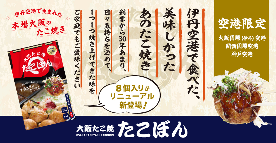 ぜひこの機会に、大阪国際空港(伊丹空港)で長年愛され続けてきた『たこぼん』のたこ焼きをご賞味ください。