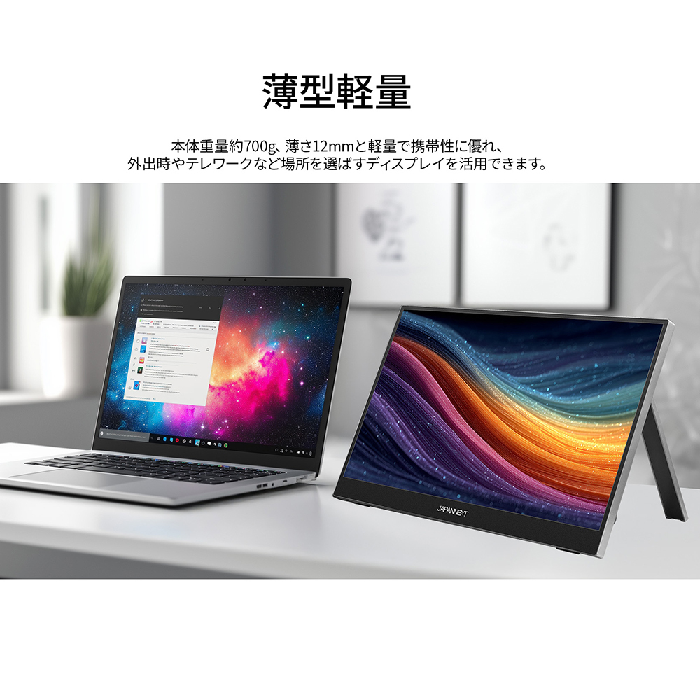 約700gの軽量設計と最薄部12mmの薄型本体は、優れた携帯性を備えています。ワーケーション中や外出先、ご自宅のリビングなど、大きなディスプレイを設置できないさまざまな環境でも、手軽にマルチディスプレイ環境を構築可能です。高精細な画面により、写真や資料の表示はもちろん、プレゼンテーション時にお客様へ画面をお見せしたり、外出先でゲームや動画コンテンツを楽しむなど、幅広い用途に対応します。