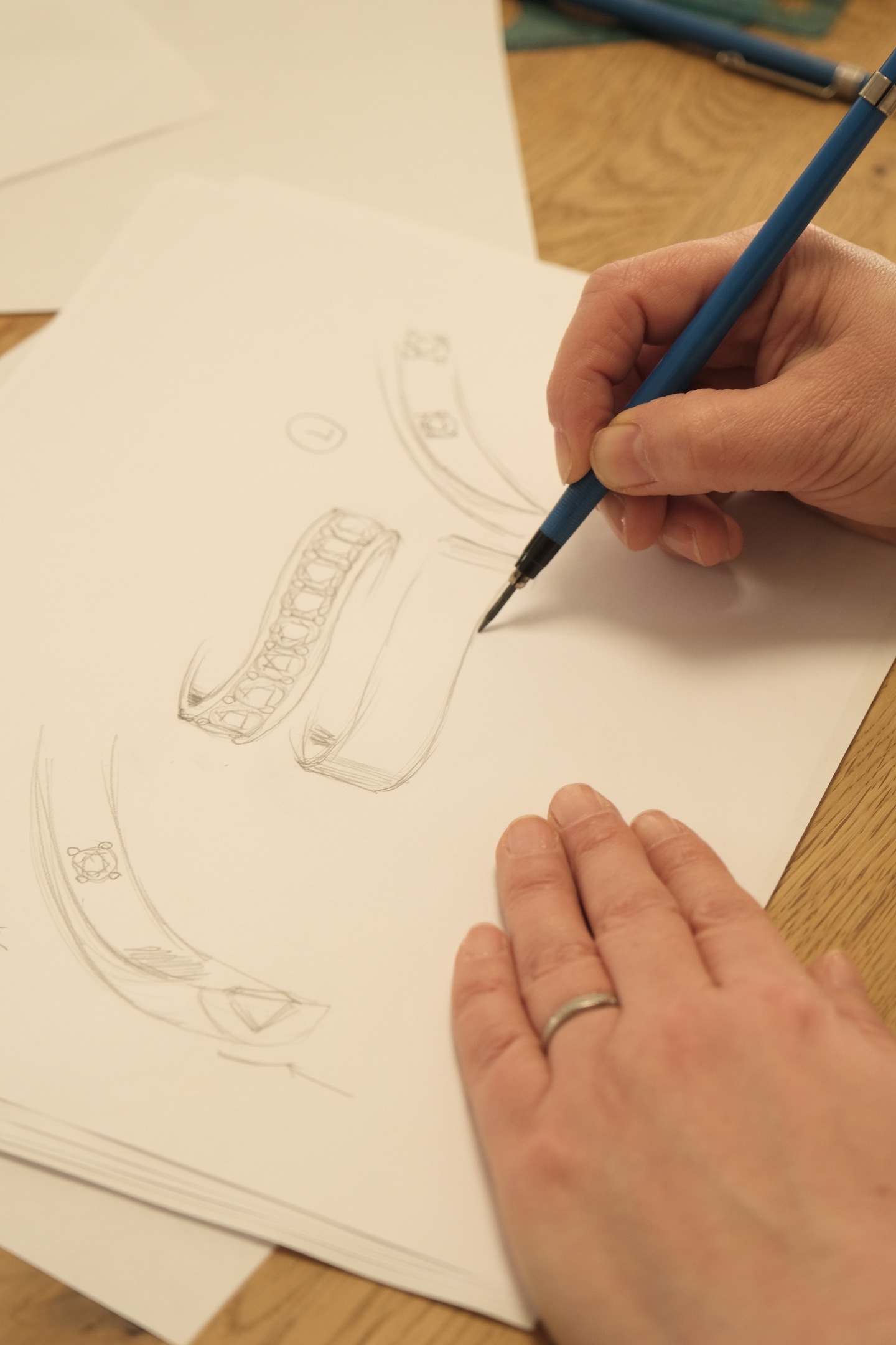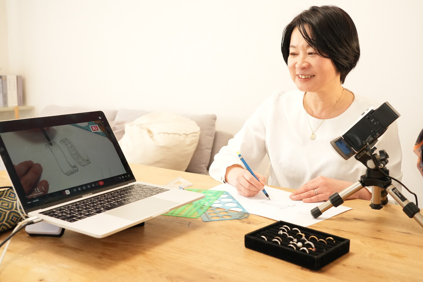 オンライン会議システムを通じ、お客様の目の前でリアルタイムにジュエリーのデザイン画を描き上げる独自の手法です。これまでに「自分のイメージがその場で形になる感動がある」「対面よりも細部まで確認できる」と高い評価をいただいております。