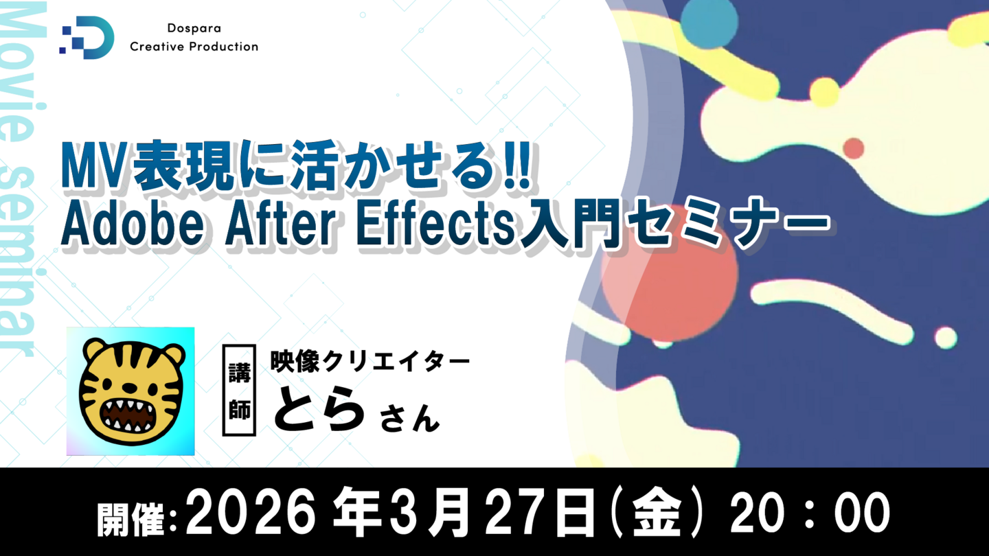 ドスパラは、映像クリエイター とら氏を講師に迎え、『MV表現に活かせる!!Adobe After Effects入門セミナー』を2026年3月27日(金)20時よりオンラインで開催します。現在、参加者を募集しています。