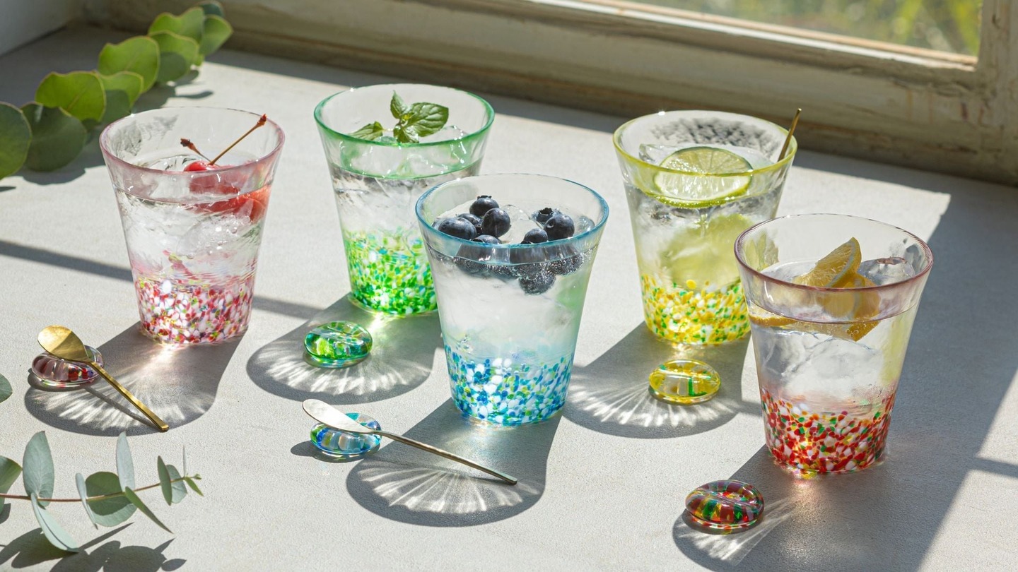 手吹きならではの揺らぎや厚み、光を受けてにじむ色の粒子が、透明感のある奥行きを与えます。