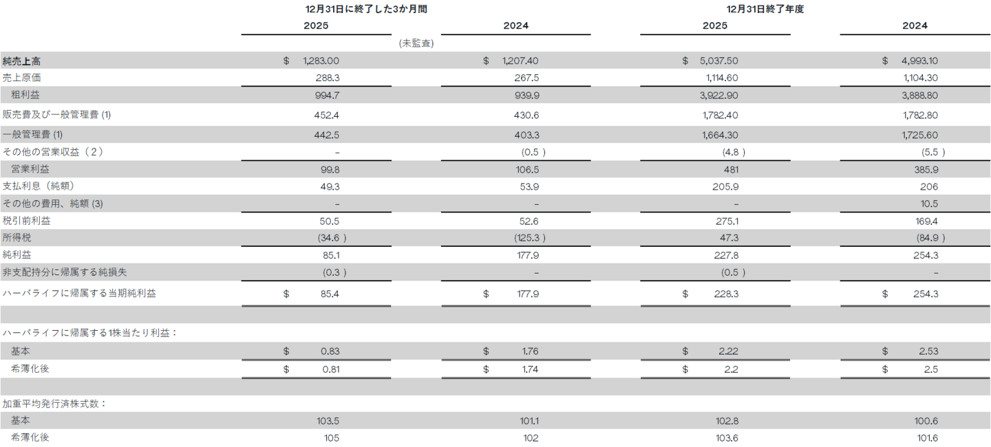ハーバライフは2025年第4四半期の純売上高が13億ドル(前年同期比6.3%増)と報告した。この増加には為替の追い風による80ベーシスポイントが含まれる。為替変動の影響を除いたベースでは、四半期の純売上高は前年同期比5.5%増加した。