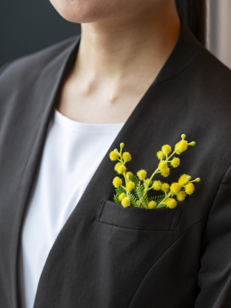 国際女性デーのシンボルである「ミモザ」に想いを込め、期間中はスタッフがミモザのコサージュを着用。