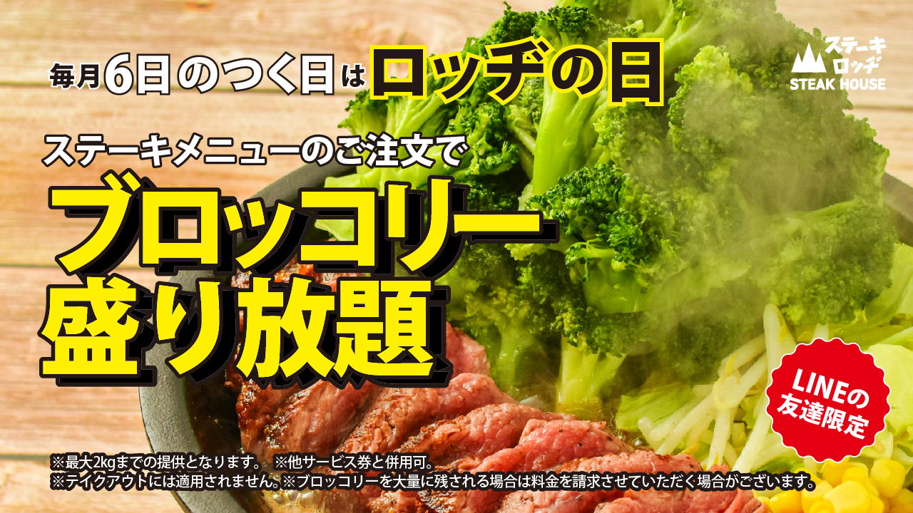 『ステーキロッヂ』『肉と炒め野菜 ステーキロッヂ』にとって、3月10日の「ミートの日」は年に1度の記念日ですが、毎月6のつく日(6日、16日、26日)は「ロッヂの日」としてお客様への還元サービスを行っています。