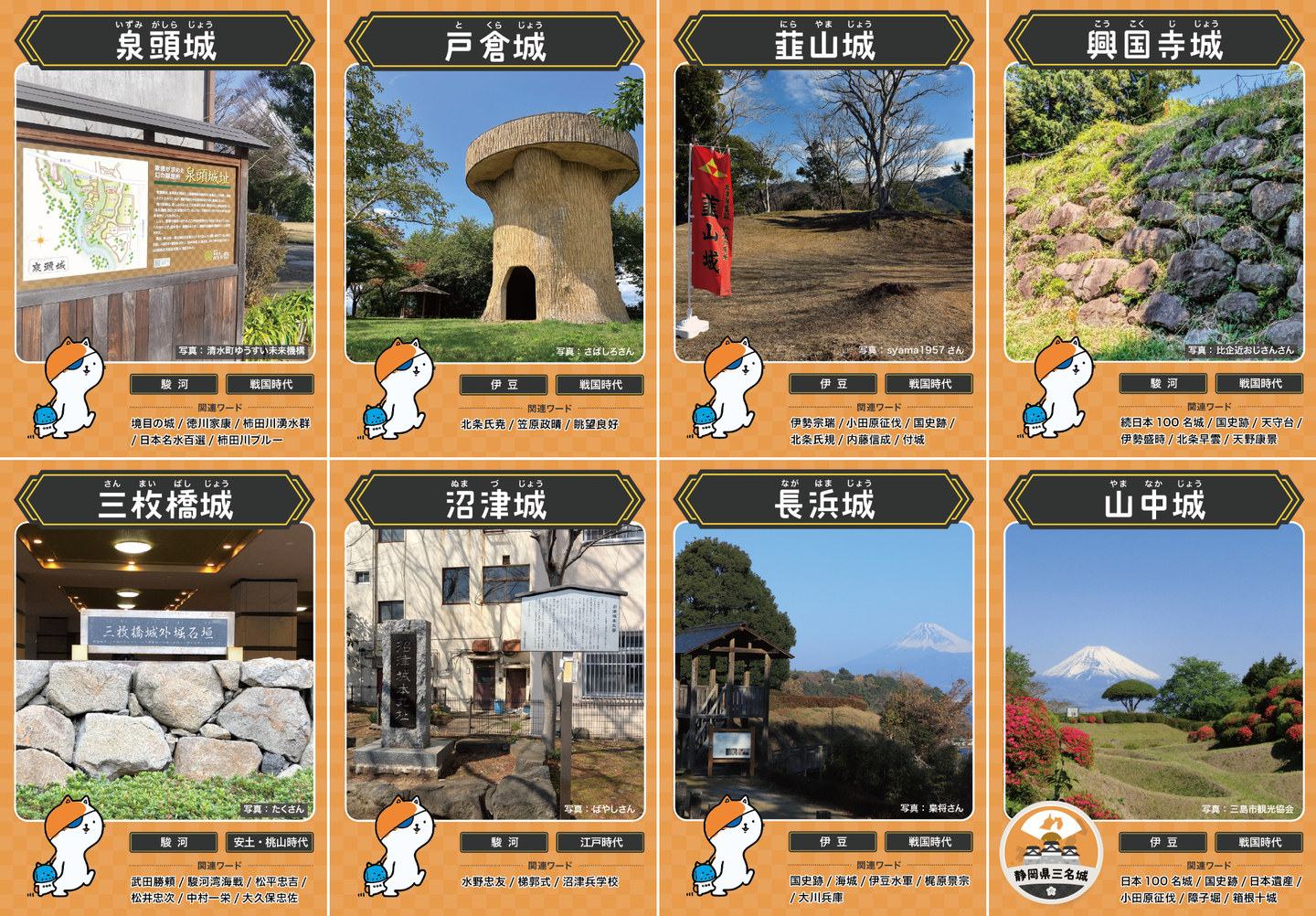 対象となるお城は、泉頭城・戸倉城(清水町)、韮山城(伊豆の国市)、興国寺城・長浜城・沼津城・三枚橋城(沼津市)、山中城(三島市)の8城です。