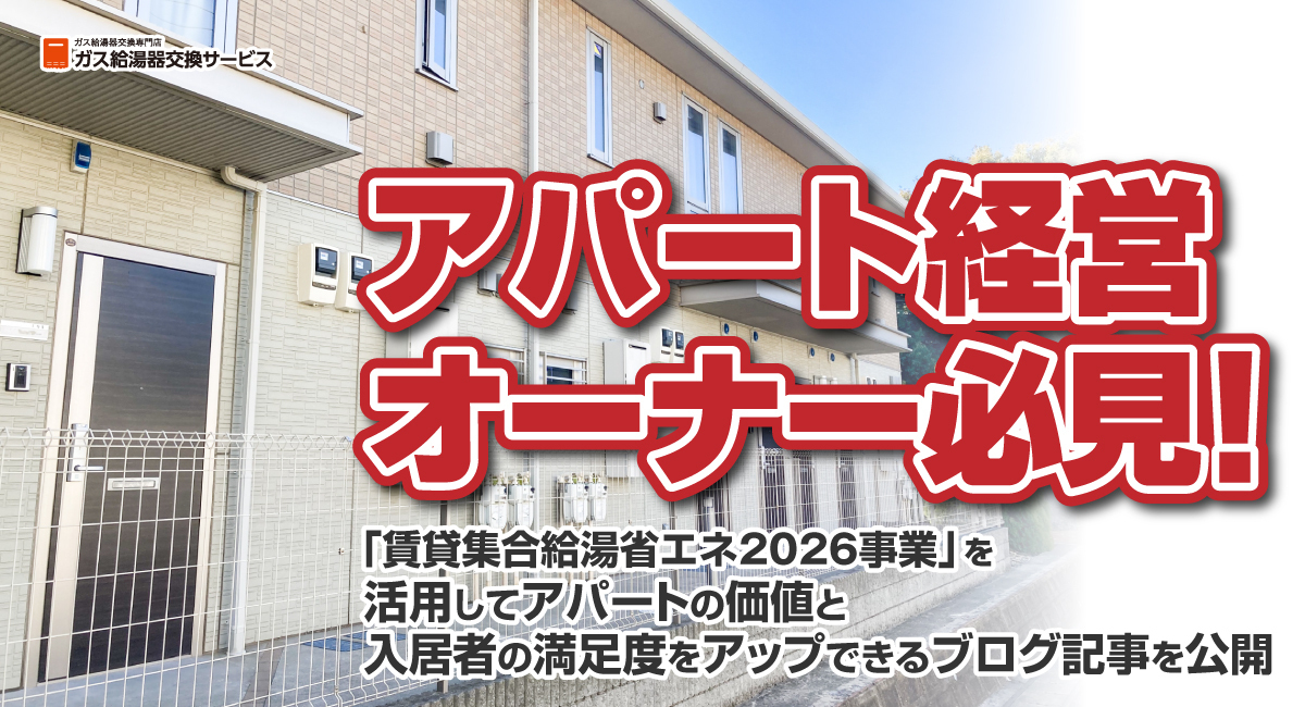 アパート経営オーナー必見!「賃貸集合給湯省エネ2026事業」を活用してアパートの価値と入居者の満足度をアップできるブログ記事を、ガス給湯器交換サービスが公開