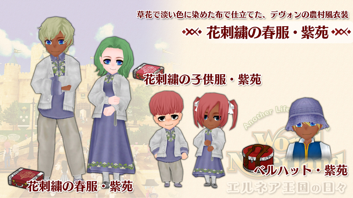 株式会社アルティは、Nintendo Switch™版人生シミュレーションゲーム『ワールドネバーランド エルネア王国の日々』にて、新規追加コンテンツ『花刺繍の春服・紫苑』を2026年3月5日より配信開始いたしました。今年で生誕11周年を迎える本作は、架空の王国で一人の住民として自由な人生を送り、次世代へと物語を紡ぐ箱庭ライフシミュレーションです。最新DLCとなる『花刺繍の春服・紫苑』は、早春の野辺に咲く薄紫色の可憐な花々をイメージした一着。草花で淡く染めた布に刺繍を施したデヴォンの農村風衣装となっており、親子でお揃いのコーディネートを楽しめます。全世界250万DLを突破し、28年続く「ワーネバ」シリーズの最新作として、今後もPlayStation版の発売を控えるなど多角的な展開を続けてまいります。春の訪れを感じる新衣装で、自分だけの王国生活を彩りましょう。