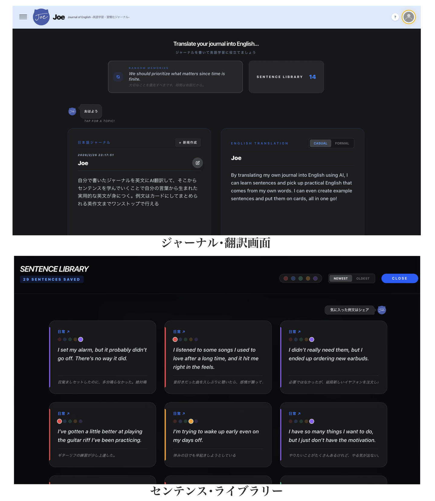 日本語で綴ったジャーナル・日記をAIが瞬時に自然な英語へ翻訳し、自分専用のフレーズ集を構築できる英語学習・習慣化Webアプリケーション『Joe – Journal of English』(読み:ジョー)を、2026年2月にリリースしました。