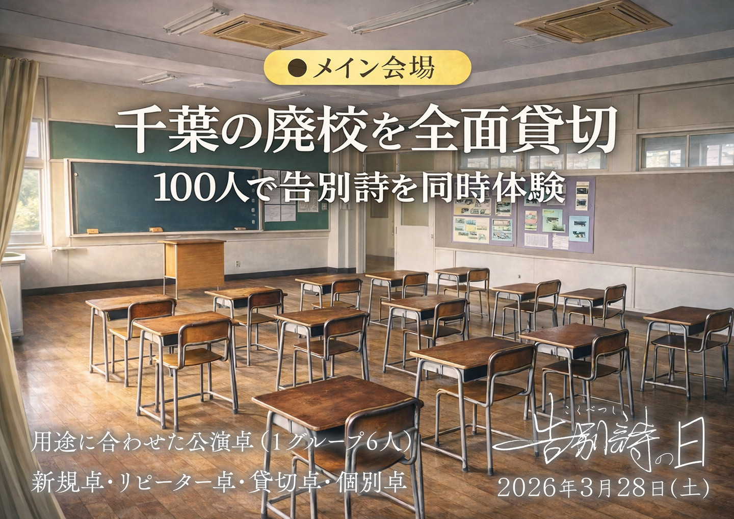 3月28日開催・横芝光町の廃校で味わう“青春と記憶の物語” 2026年3月28日(土)、千葉県山武郡横芝光町の廃校を舞台に、人気ストーリープレイング作品 「告別詩」 を体験するリアルイベント 「告別詩の日」 が開催されます。詩のように美しく、切なく、熱量ある物語を、100名規模で同時に体験できる特別な一日です。初心者からリピーターまで、感動と共に楽しめる体験型ゲームイベントとして、各地からの参加が見込まれています。