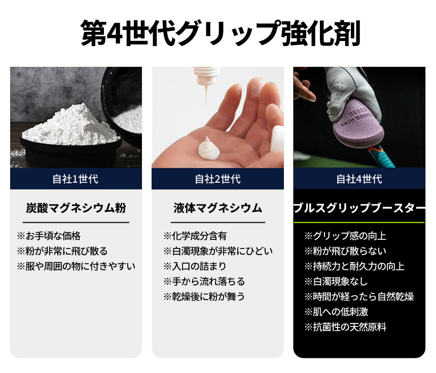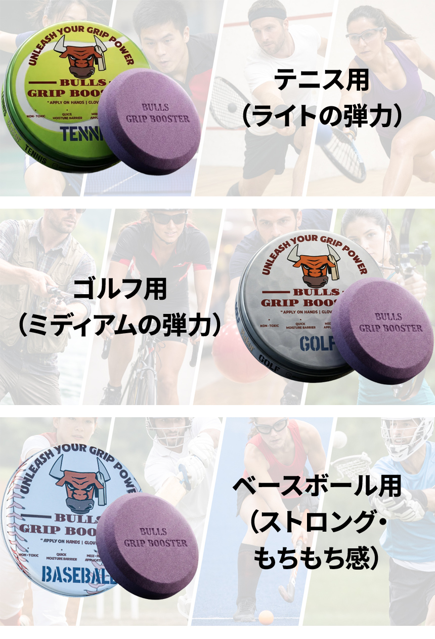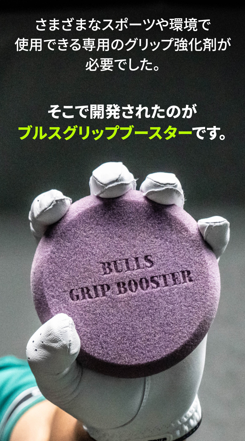 ブルスグリップブースターは独自のグリップ成分が汗や水分を素早く放出し、単に表面をコーティングするのではなく、滑りの原因を抱え込むように作用するため、時間が経っても「吸い付くようなもちもち感」が持続します。