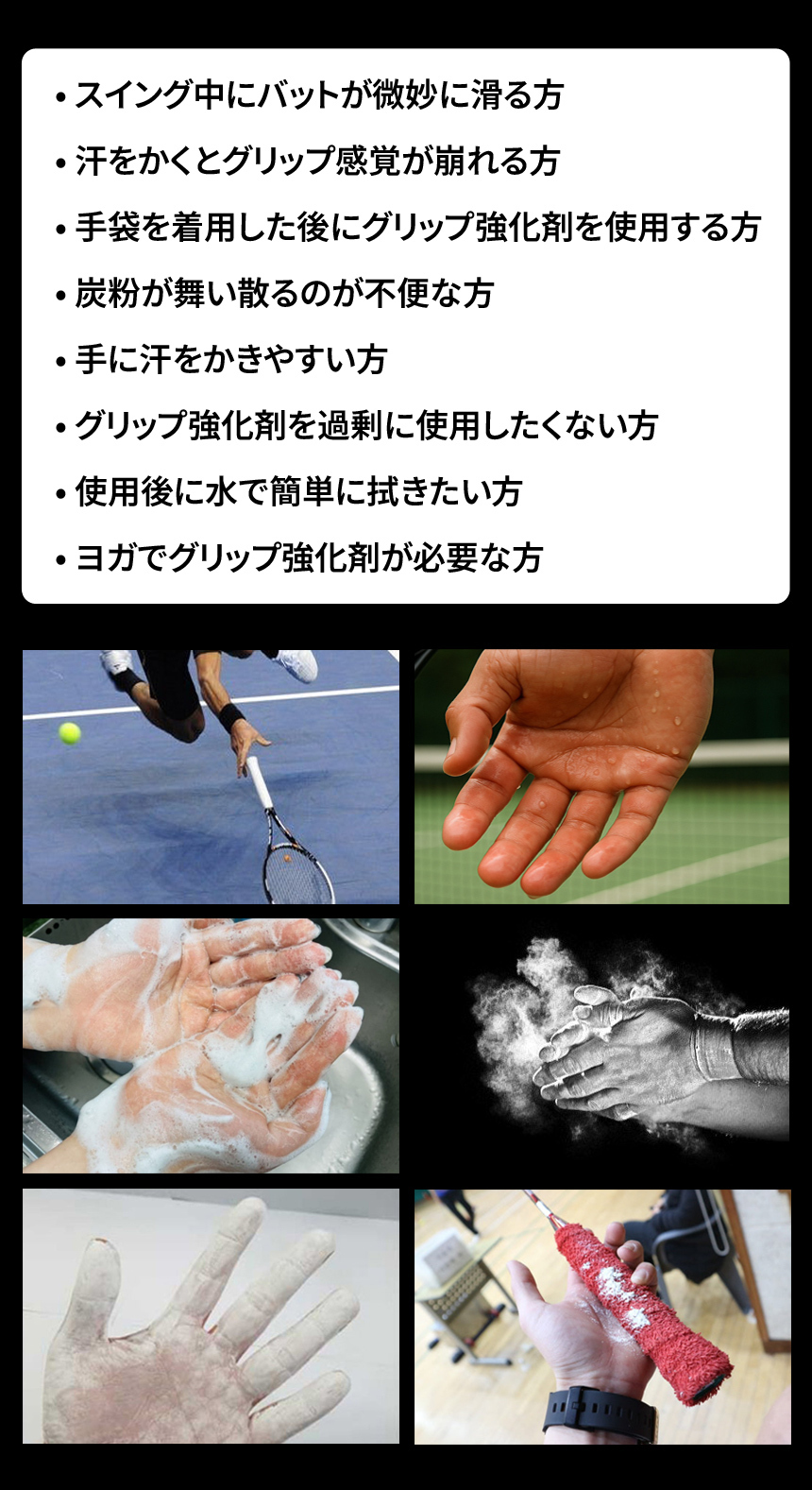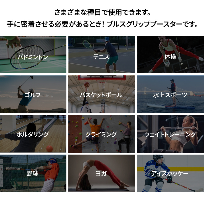 日本の湿潤な気候に特化した配合! ゴルフ,テニス,野球,ヨガや水上スポーツなど手に簡単に密着!。