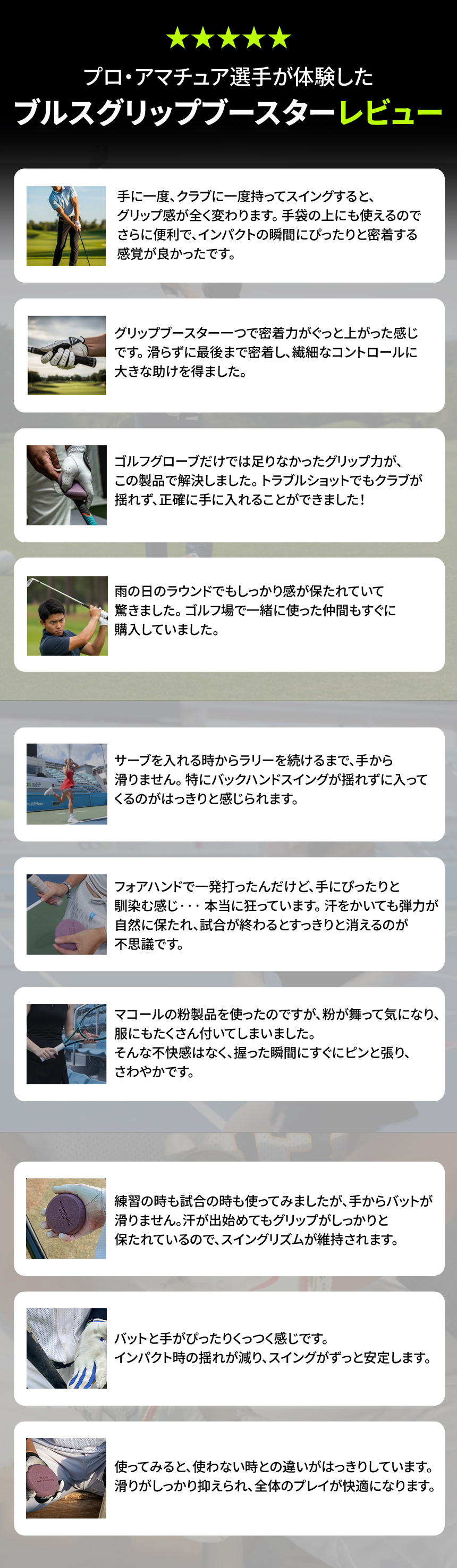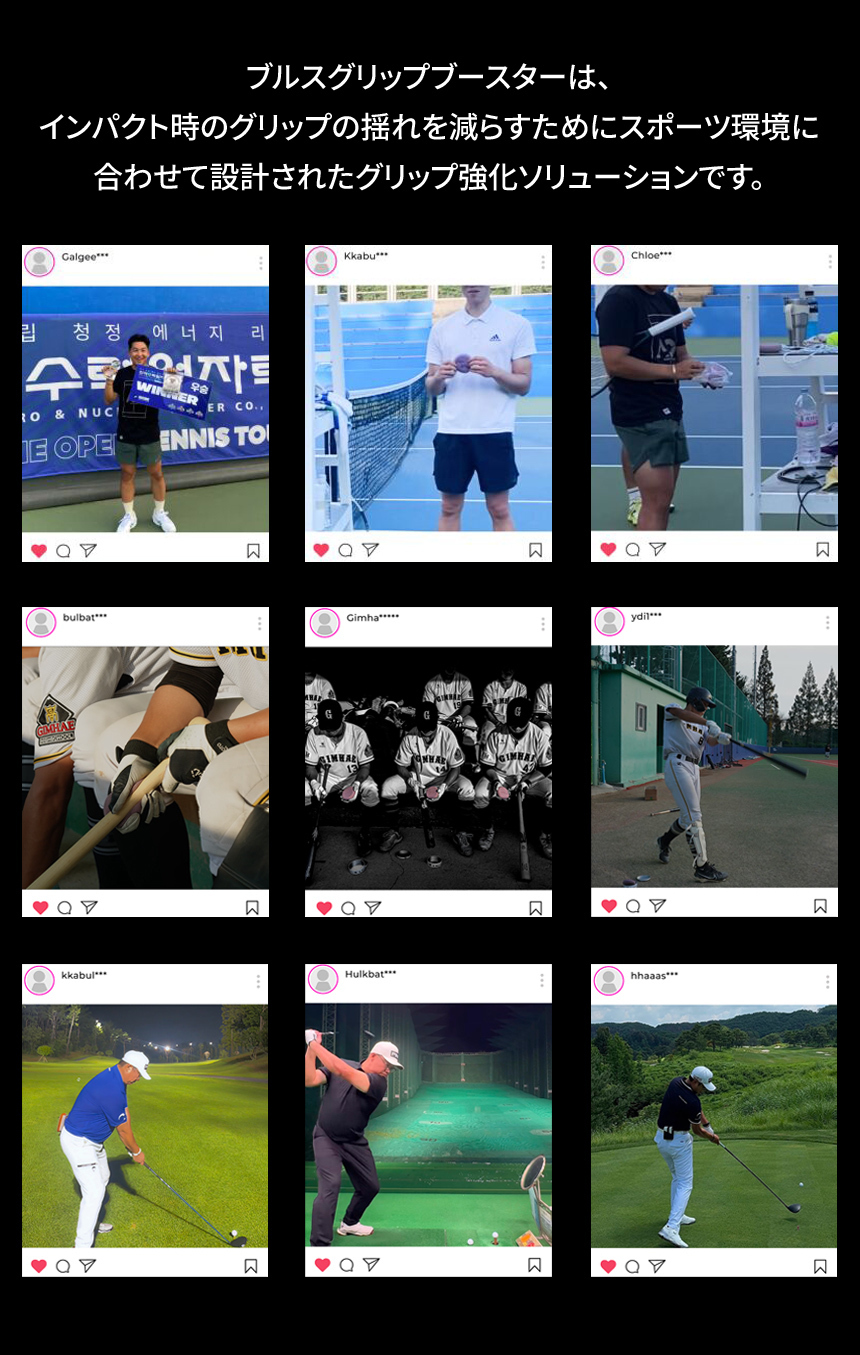 ブルスグリップブースターを実際に3種目のスポーツ選手に使用し、グリップの安定性とスイングコントロールのテストを行いました。
