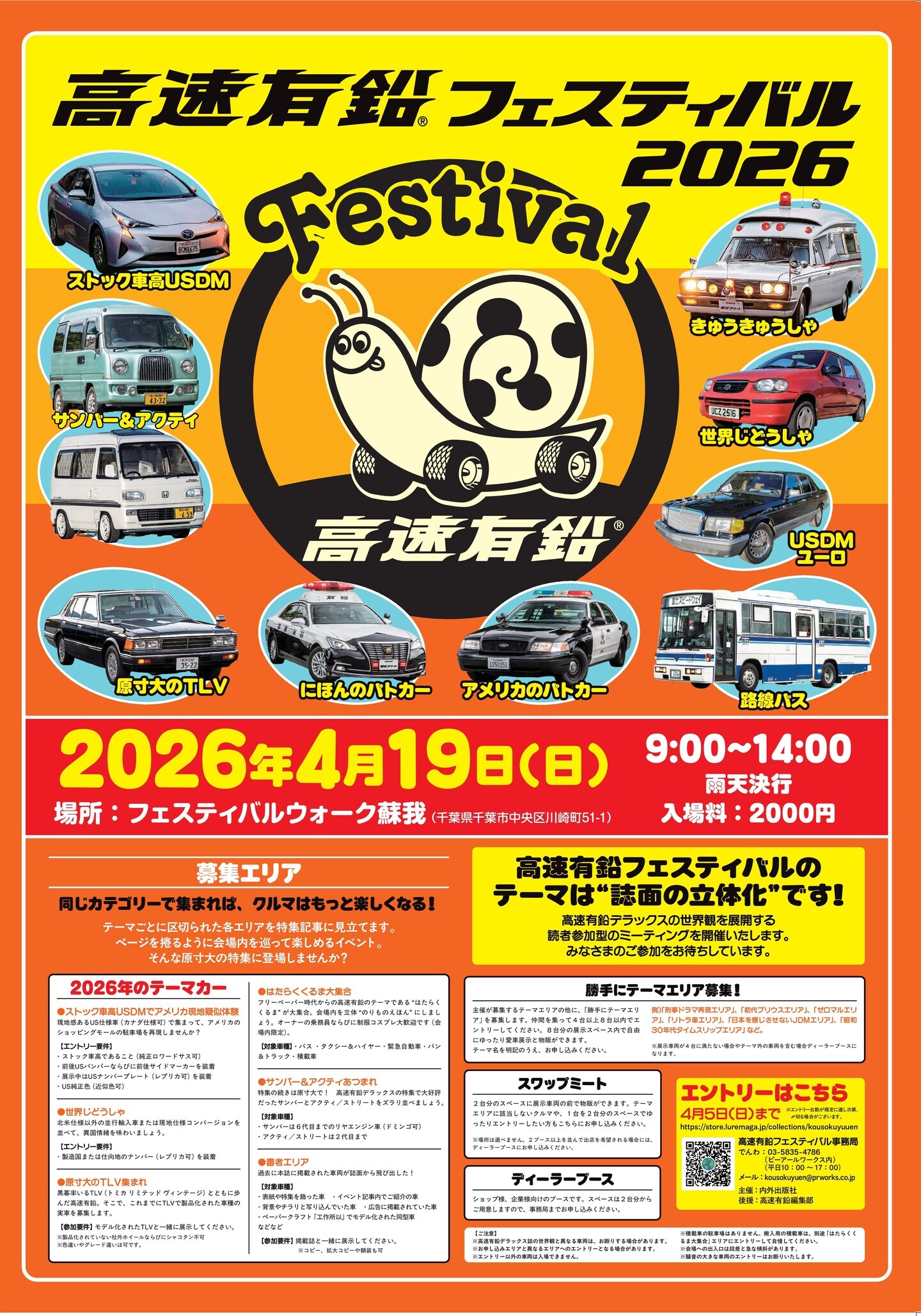 仲間を集って4台以上8台以内でエントリーしてください。8台分の展示スペース内(※1台分の駐車枠は2.5×5mです)で愛車を展示ができます。また物販も可能です。テーマ名は車名やクラブの名前から「もしも高速有鉛で特集が組まれたら」と想定したタイトルでも構いません。楽しいテーマ名をお願いいたします。