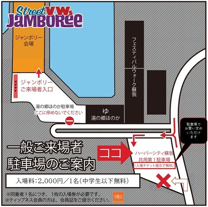 なお、一般ご来場の方向けの駐車場はこちらになります。駐車には入場チケットが必要ですが、現地駐車場でもお買い求めいただけます。