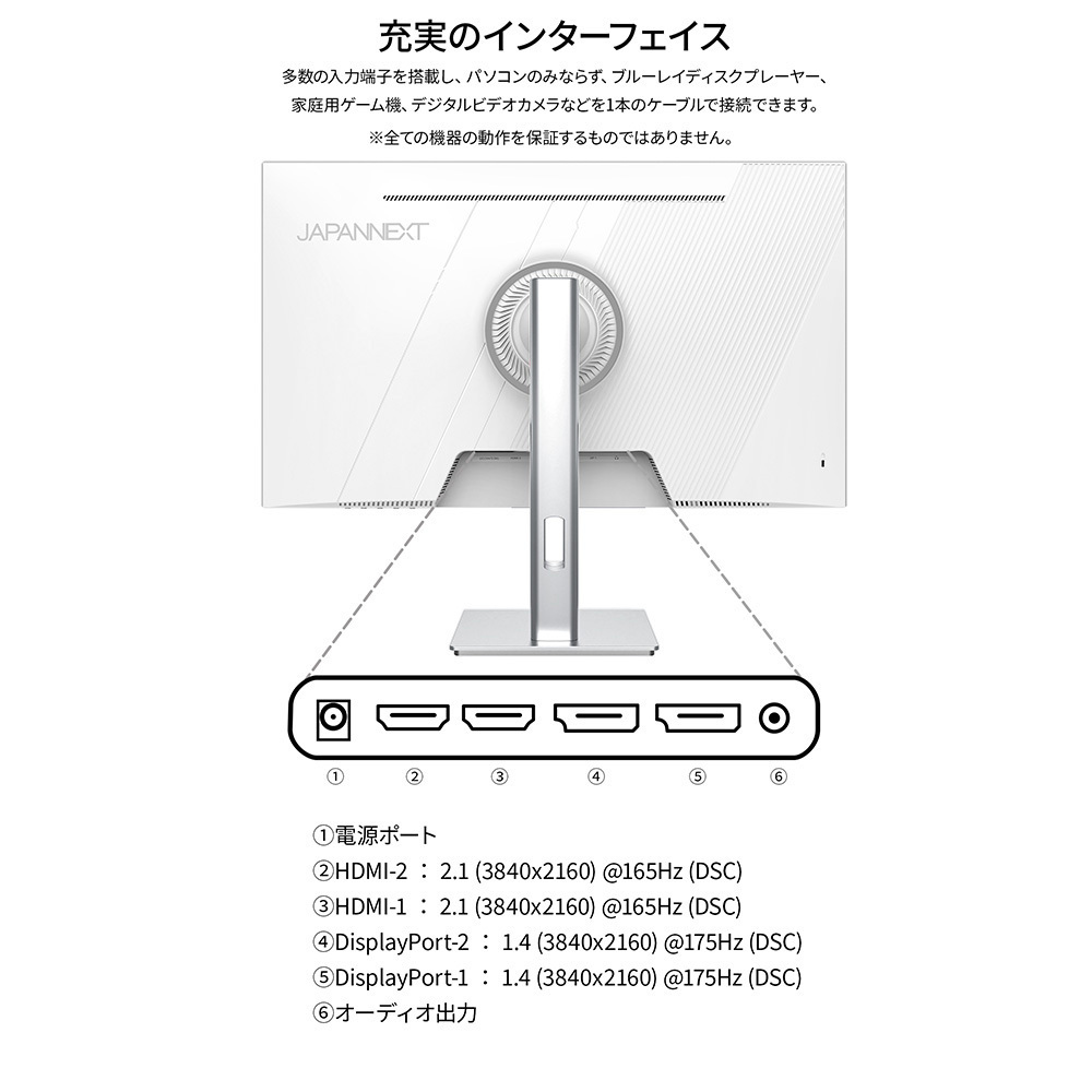 | 入出力端子 | HDMI 2.1×2 (DSC:165Hz) DisplayPort 1.4×2 (DSC:175Hz) オーディオ出力×1 |