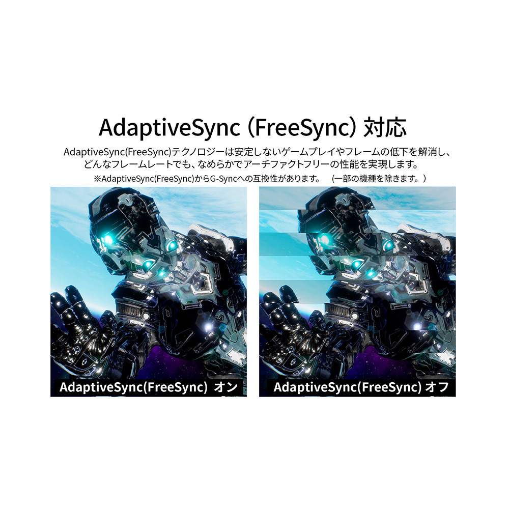 AdaptiveSync(FreeSync)に対応。画面のリフレッシュレートとコンテンツのフレームレートのズレから生じるティアリングを防ぎ、滑らかで美しい映像を実現します。また、長時間使用時に眼に優しいフリッカーフリー(ちらつき軽減)、ブルーライト軽減モードを搭載します。