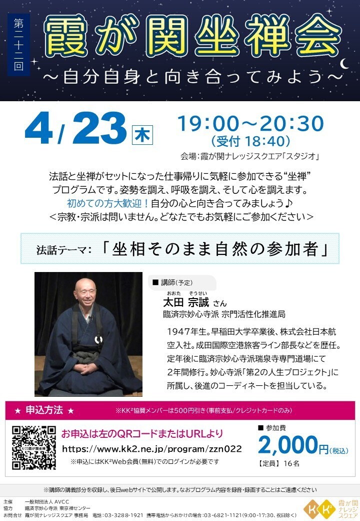 霞が関ナレッジスクエア(略称:KK² 所在地:東京都千代田区 運営:一般財団法人AVCC 理事長:久保田了司)は、2017年から仕事帰りに気軽に参加できる“坐禅”イベントとして「霞が関坐禅会」を開催してまいりました。この度、4月23日(木)に第二十二回目となる霞が関坐禅会〜自分自身と向き合ってみよう〜を開催いたします。