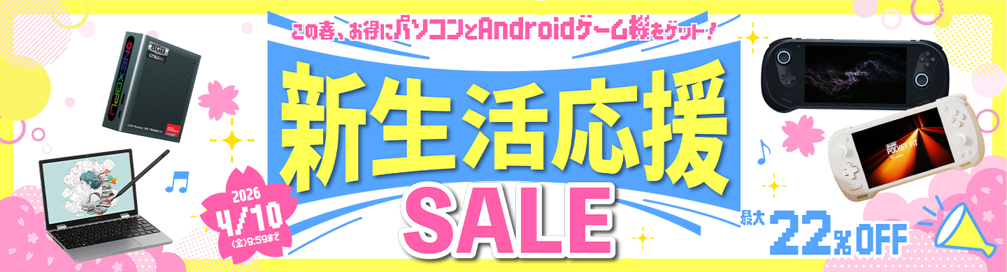 また、最新のAI PC向けプロセッサ「AMD Ryzen™ AI 9 HX 370」を搭載した「AYANEO 3 国内正規版」の22%OFFや、ビジネス・学習に最適なUMPC「TENKU Note Pro」など、春の新しい環境構築に適したラインナップを多数用意しています。