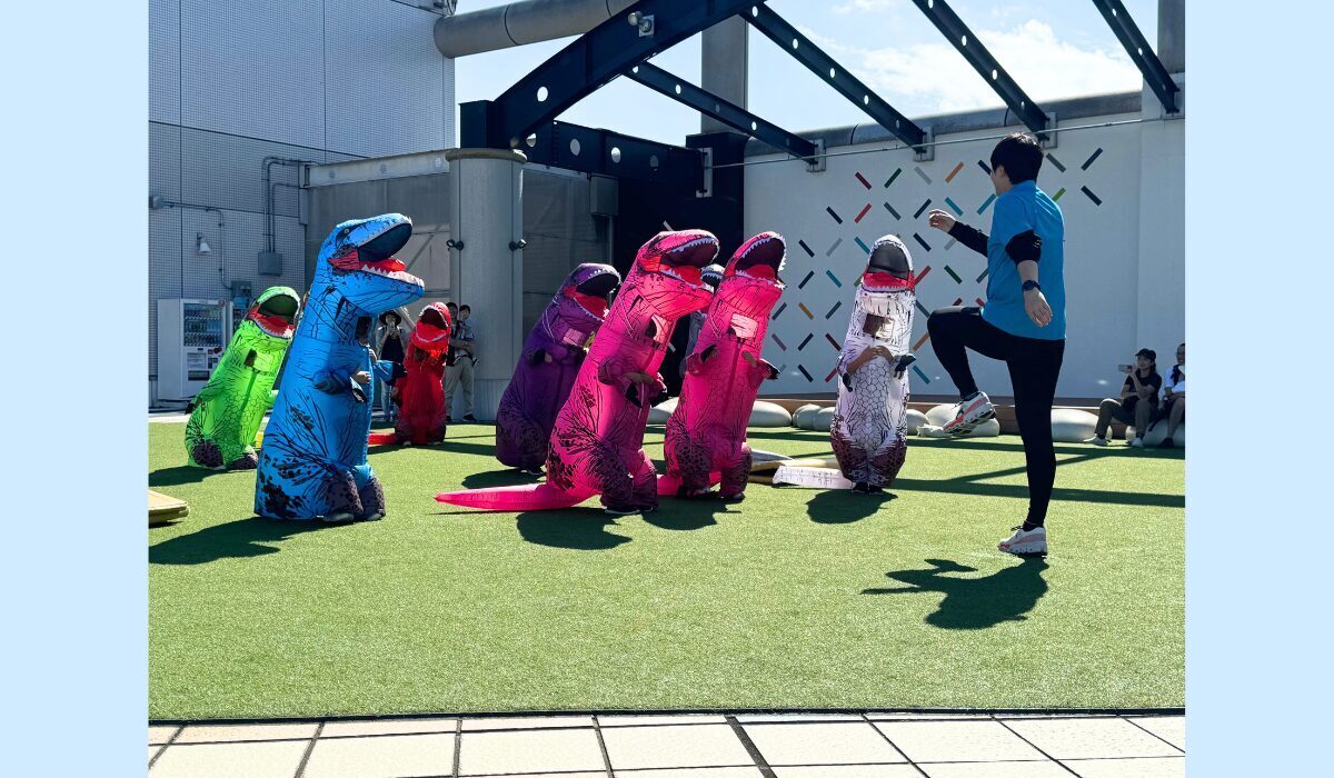 ティラノサウルスのエアコスチュームを着て走るイベント