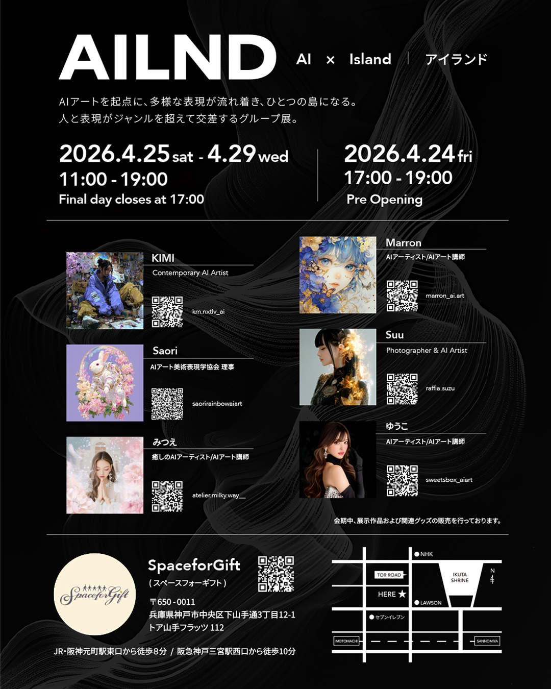 関西のAIアーティスト6名が神戸に集結AIアートを起点に多様な表現が流れ着き、ひとつの“島(Island)”となる。AIアートの可能性をリアルな空間で体感するグループ展 「AILND — AI × Island」 が、2026年4月25日(土)から4月29日(水)まで神戸・トアロードのギャラリー Space for Gift にて開催されます。