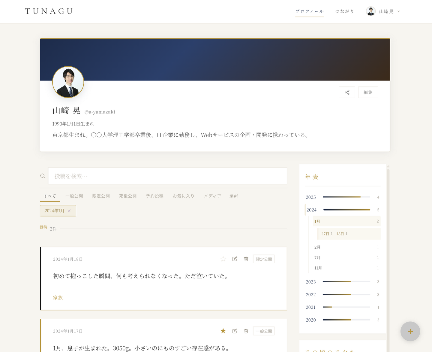 TUNAGUは、自分の人生をデジタルに記録し、家族・子孫へ受け継ぐSNSです。