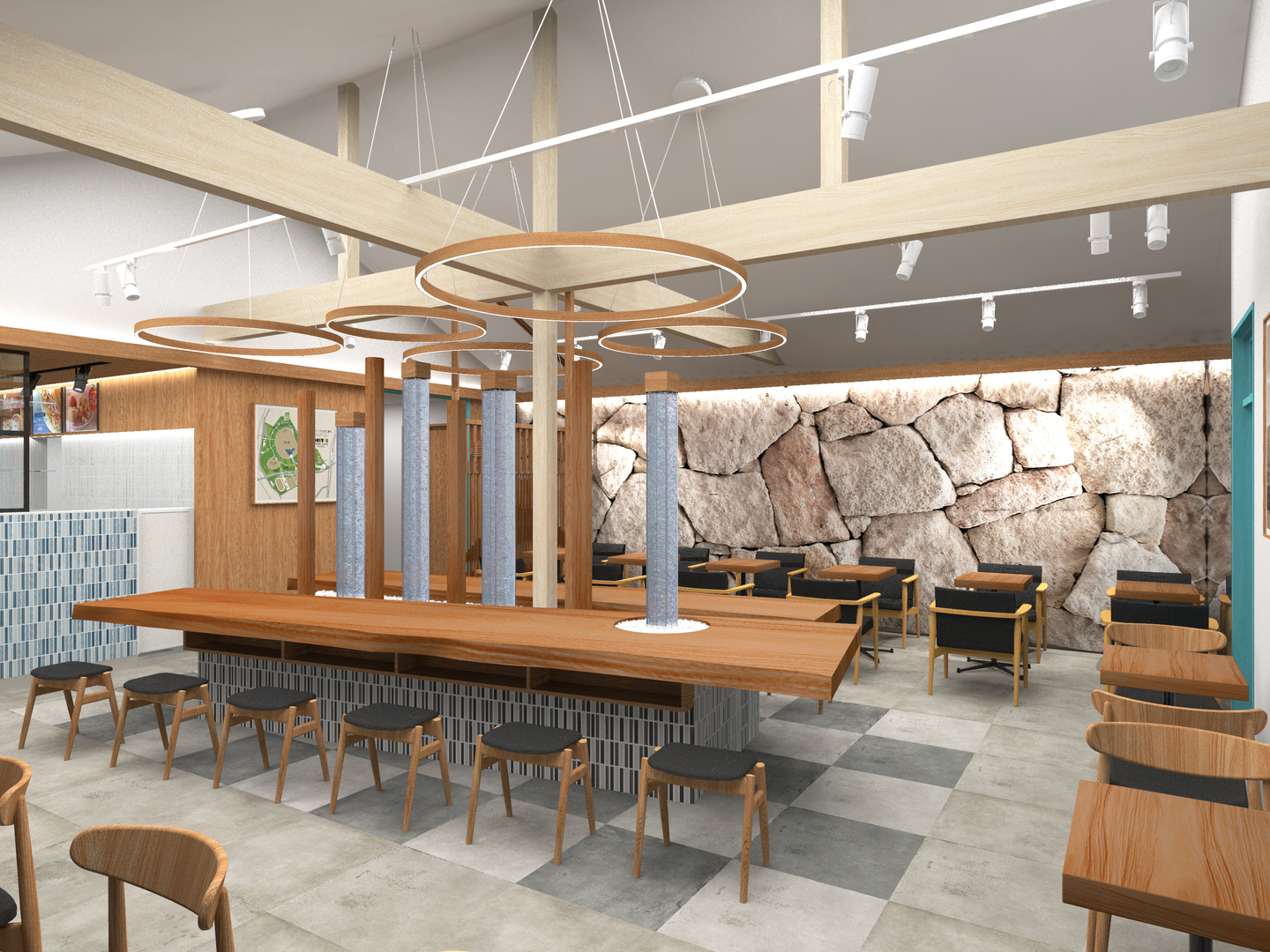 入口のサインや店内の壁面には、「花崗岩のダイヤモンド」とも称される庵治石(あじいし)を敷き詰め、自然との調和と上質感を演出。また、店内中央に配置した一枚板の大テーブルには、ケヤキの無垢材を使用しています。耐久性に優れ美しい木目が特徴のケヤキは、オリンピックの歴史とともに空間に豊かな風合いをもたらします。