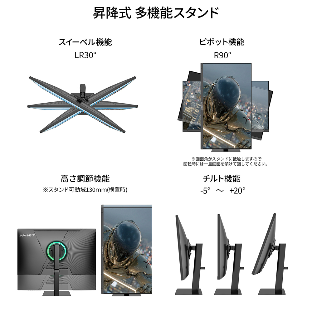 高さ調整が可能な昇降式多機能スタンドを搭載、最大130mmの範囲(横置時)で最適な高さに画面を調整可能です。また、縦画面として使用出来るピボット(回転)機能にも対応します。スイーベル(首振り)機能は、左右各30°の範囲で動かせます。