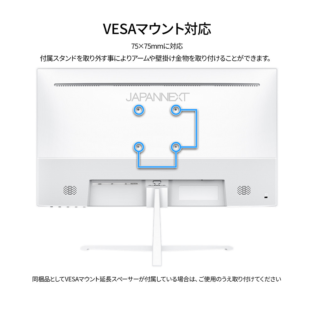 75×75mmのVESAマウントに対応しますので、別売りのモニターアームなどに使用が可能です。2W×2のスピーカーを内蔵しています。