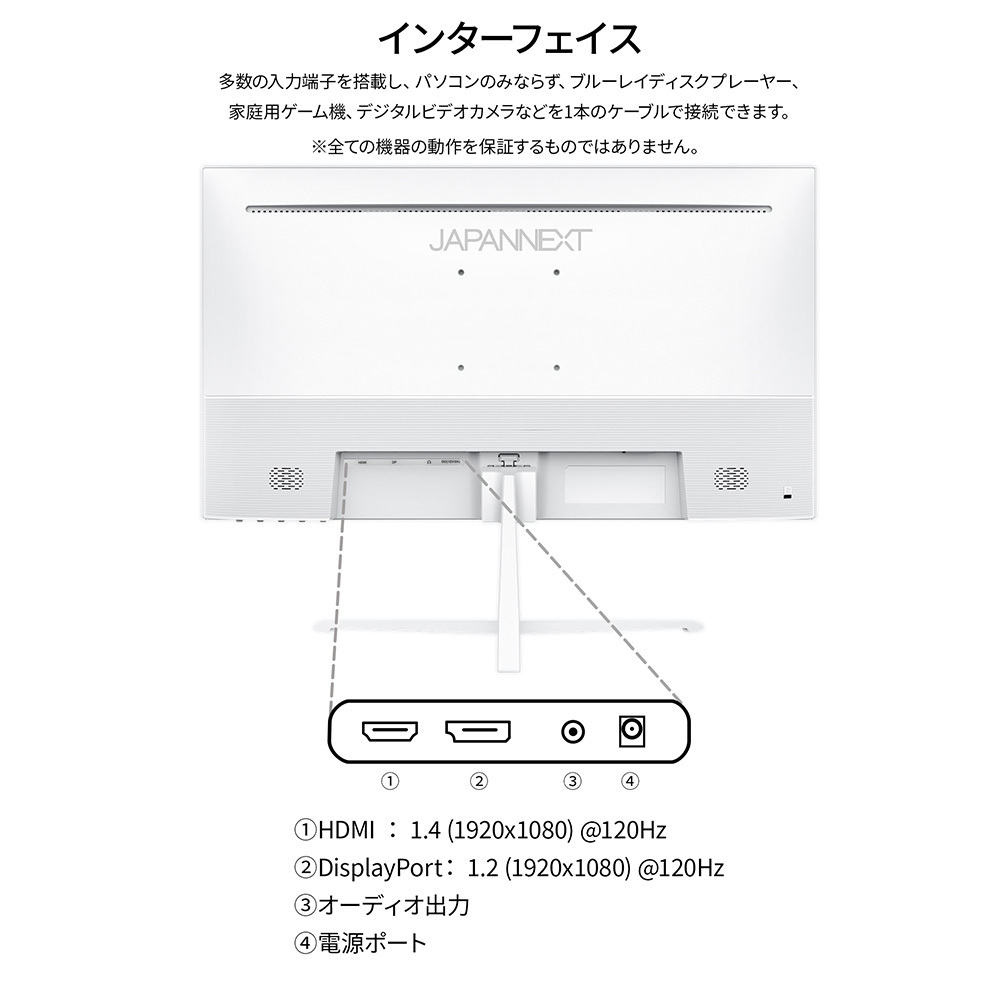 | 入出力端子 | HDMI 1.4×1 (120Hz) DisplayPort 1.2×1 (120Hz) オーディオ出力×1 |