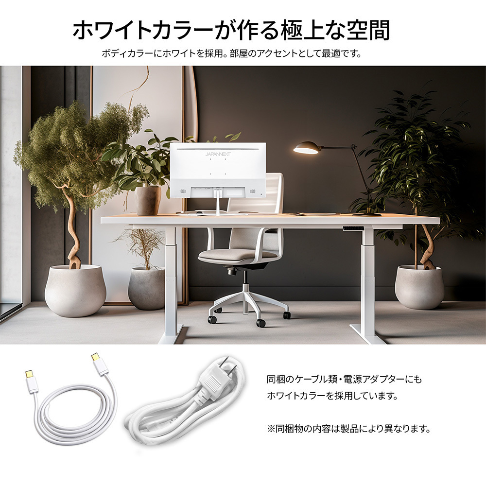 本体カラーにホワイトを採用。モニターベゼルやスタンドも白となっており、爽やかでおしゃれな空間を演出したい場合や、デバイスを白で統一したい場合に最適です。さらに、付属の電源アダプター、ケーブル類にもホワイトカラーを採用。全体が白基調に統一された部屋や医療機関などでの使用にも最適です。